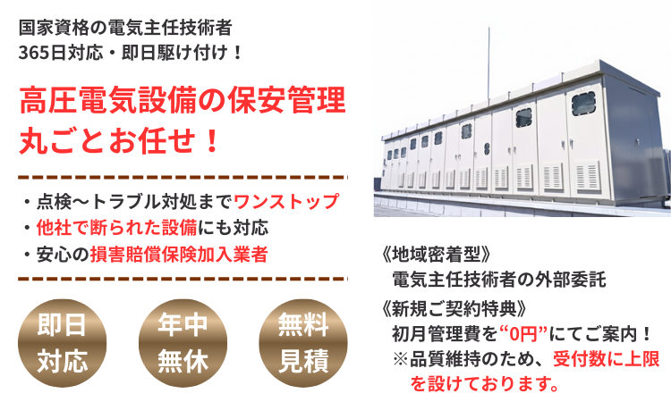 兵庫県内で高圧電気設備の保安管理サービス。「電話」または「メール」で無料概算お見積りします!