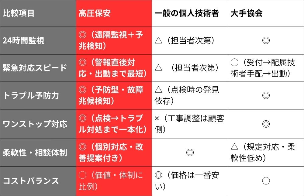 対応エリアを絞ることで移動時間を最小化し、主任技術者本人が判断できるため復旧までの流れがスムーズ。